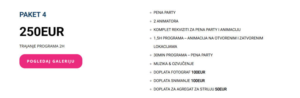 Za dodatnu zabavu, tu je i Pena Party – hit atrakcija koja unosi osmeh na lica svih uzrasta! Pena party može biti organizovan na bilo kojoj lokaciji, u prirodi ili u gradu, i predstavlja uzbudljivu avanturu sa muzikom i beskrajnim smehom. Savršeno za dečije rođendane, porodična okupljanja, ali i team buildinge i druge posebne prilike.